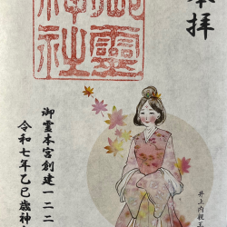 今年は御霊神社創建1225年になります。これを言祝ぎ、10月の御朱印は井上内親王をデザインしています。